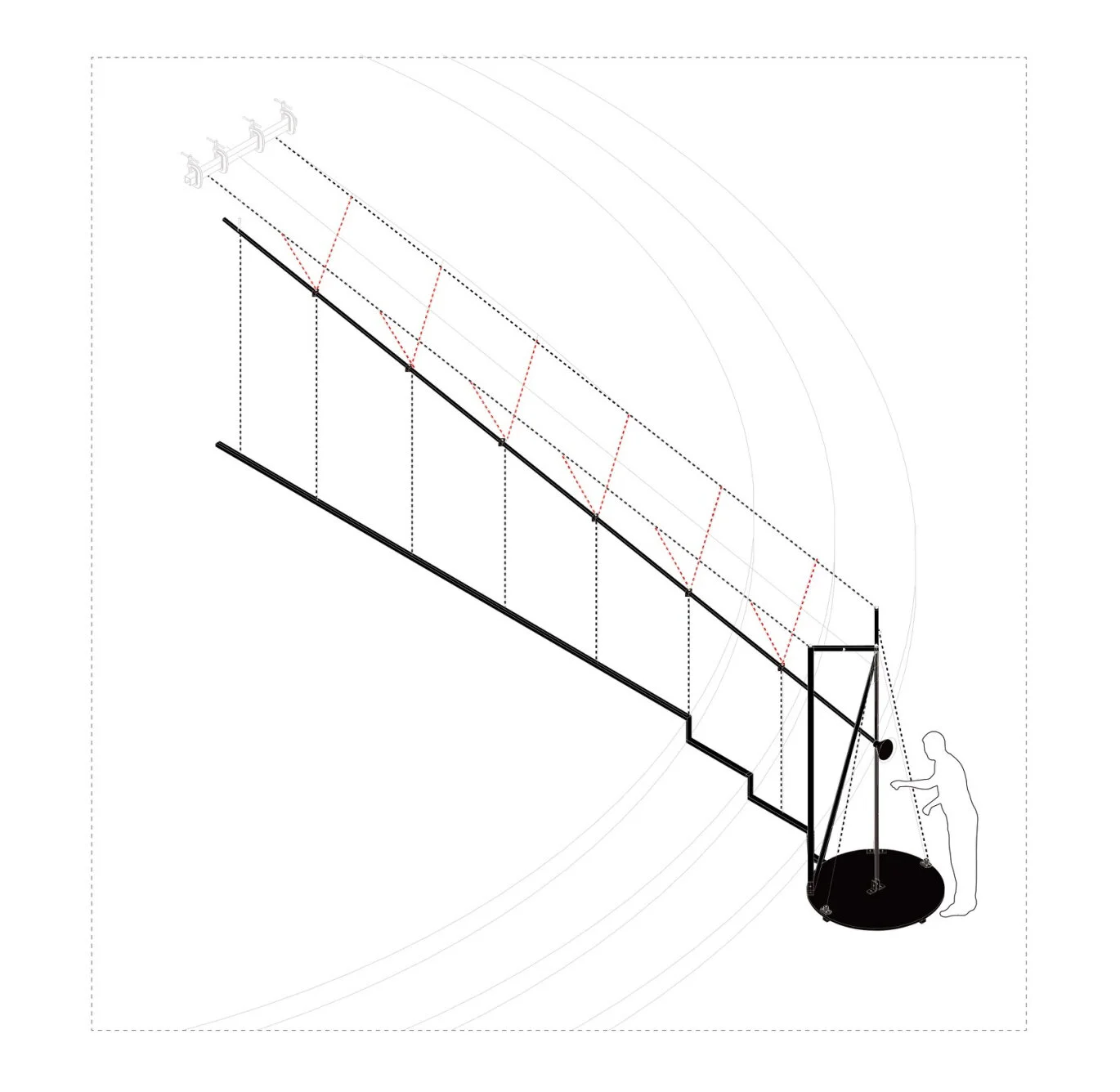人傳達訊息的轉換與轉變都是生活中不可見的軌跡,隨時在晝夜之間啟動連結彼方與此方的「日常關係」,本次裝置我們試圖將平常未見的訊號景象變成可見的風景,由無形的聲量轉成有形的光體再轉為動能分隔空間,作品有兩個表述,一部分作為空間規劃使它產生觀展的方向指引,另一部分在觀者上重現了兩點之間肉眼不可視的緊密關聯,以聲光代替身體穿梭美術館。